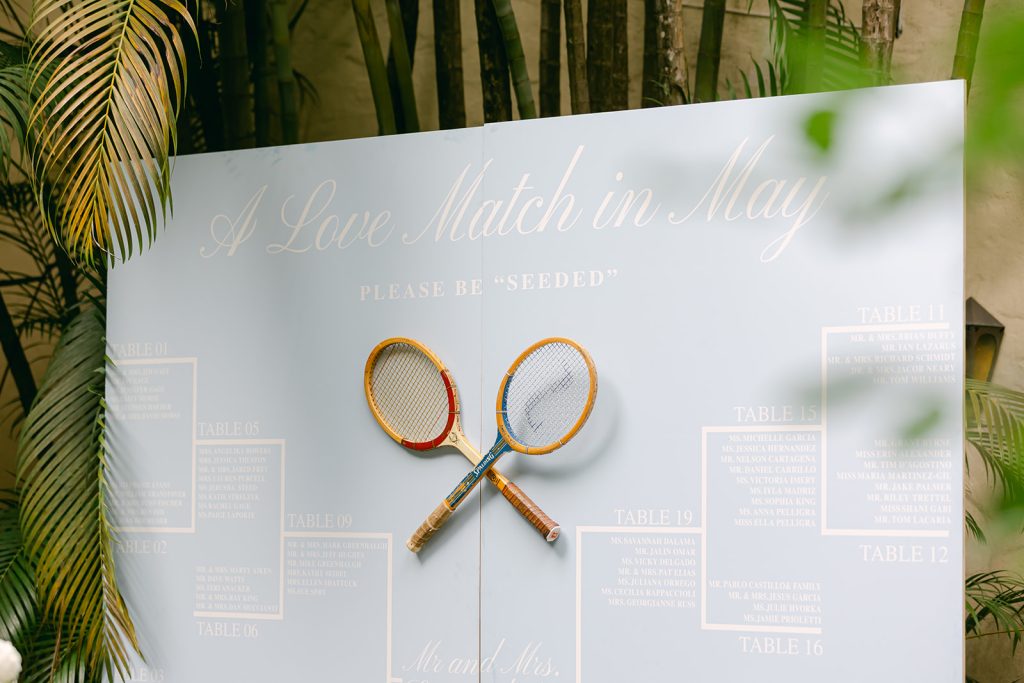 Their romantic ceremony at Villa Woodbine set the stage for an unforgettable day. Guests were greeted by a tennis-inspired seating chart that read “A Love Match in May” with the clever note “please be seeded,” complete with rackets displayed down the center. This was a playful nod to the couple’s shared love for the game. From there, the celebration flowed seamlessly to a stunning cake by Cloud 9 Bakery and endless fun inside the Dipp PhotoBooth.