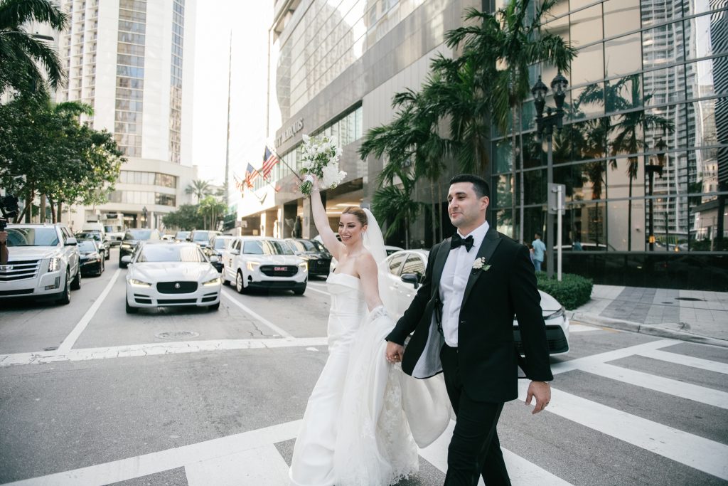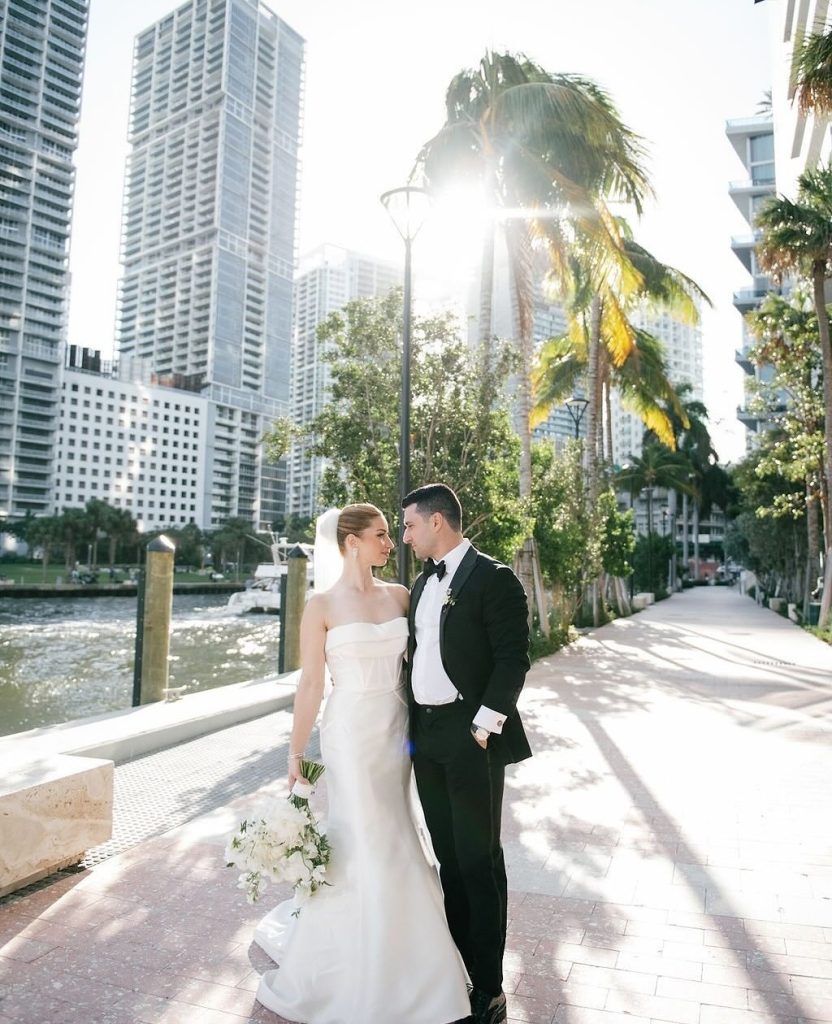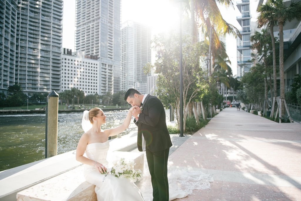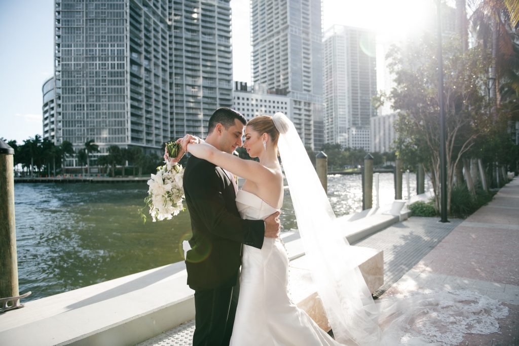 Against the vibrant backdrop of Downtown Miami and the shimmering waters of Biscayne Bay, the newlyweds embrace the magic of their post-wedding photoshoot with Maria Jose Photography, capturing the essence of their love amid the city’s dynamic energy. The towering skyline, iconic palm trees, and reflections of the sun on the bay create a breathtaking contrast to the couple’s elegant wedding attire, making every shot a perfect blend of romance and modern sophistication.