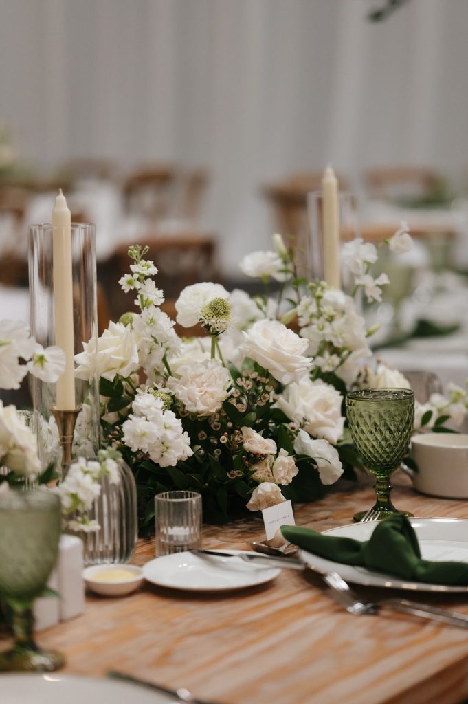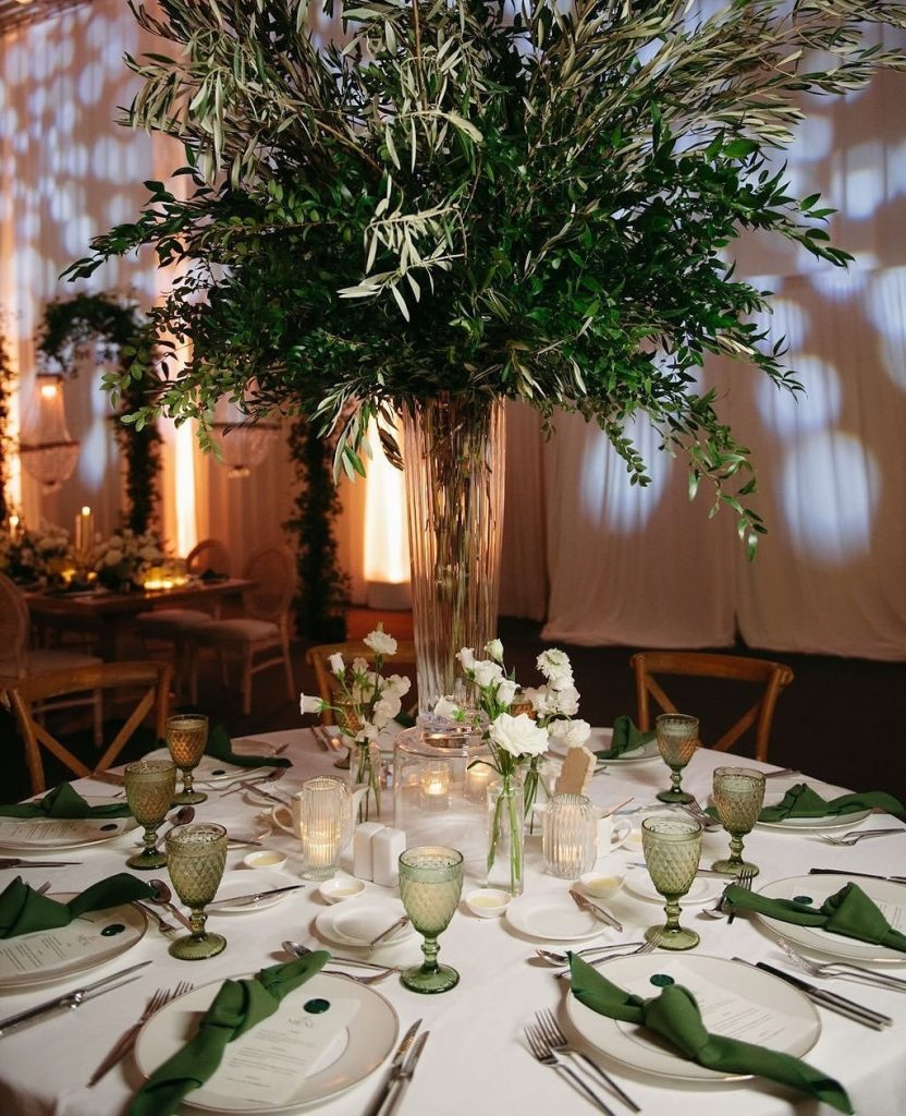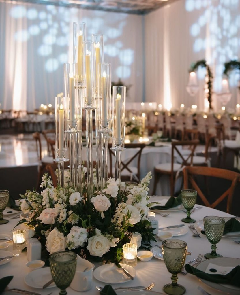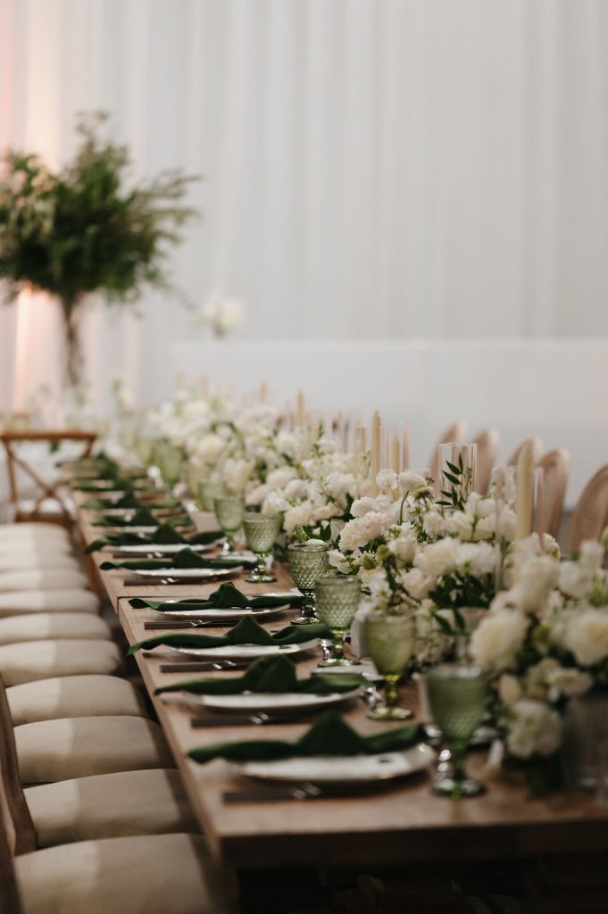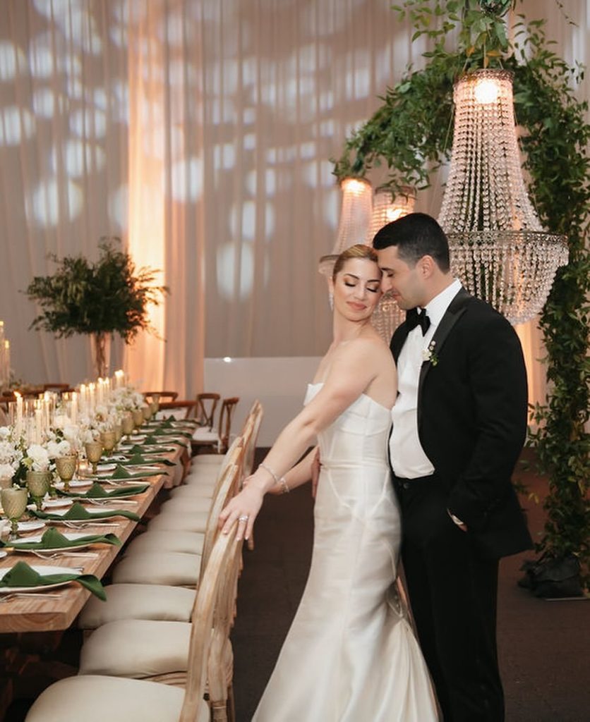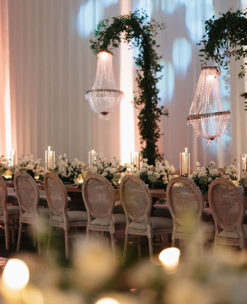 The reception featured stunning tablescapes adorned with lush greenery, white floral arrangements, soft candlelight, and gold-accented details. The long wooden dining table is lined with vintage-inspired cane-back chairs, creating a sophisticated yet inviting atmosphere. Overhead, grand crystal chandeliers draped in cascading greenery add a touch of romance and drama, beautifully complementing the warm, ambient lighting against the draped white walls. The result is a dreamy, intimate setting that blends classic luxury with natural elements, making this wedding a true fairytale affair in the heart of Miami.