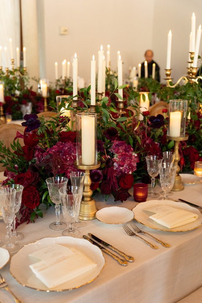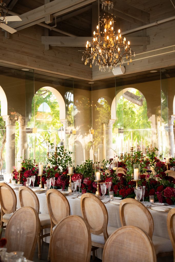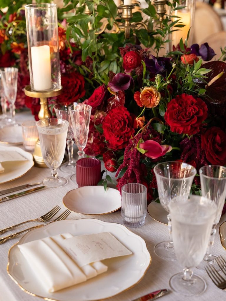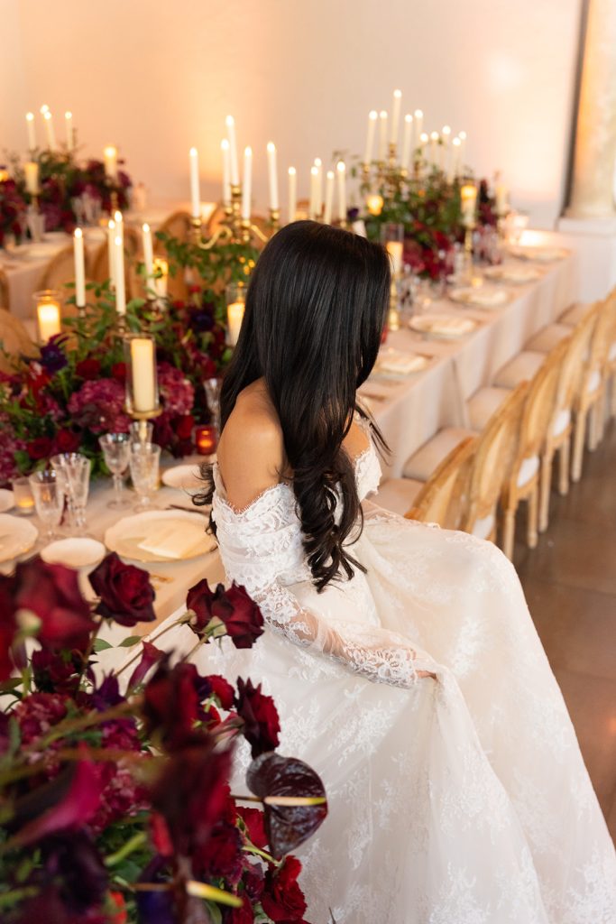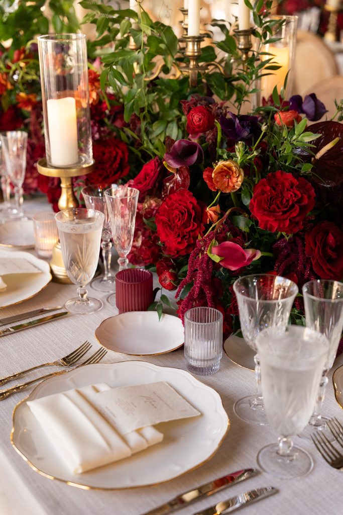 That deep red palette carried seamlessly throughout the entire celebration, weaving its way into every design element. Thoughtfully curated decor and rentals by Elements & Accents brought texture, depth, and cohesion to the space, elevating the atmosphere into something truly immersive. Every detail felt intentional, building on the moody romance that defined the day.