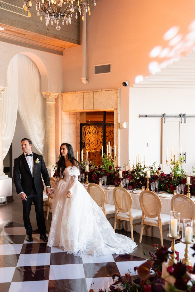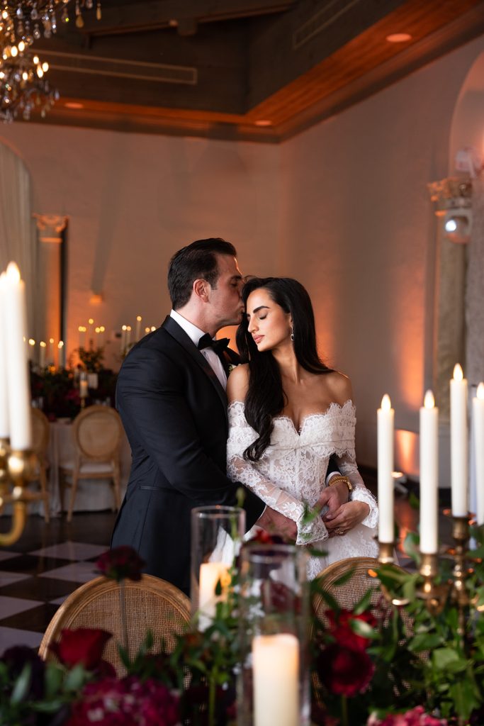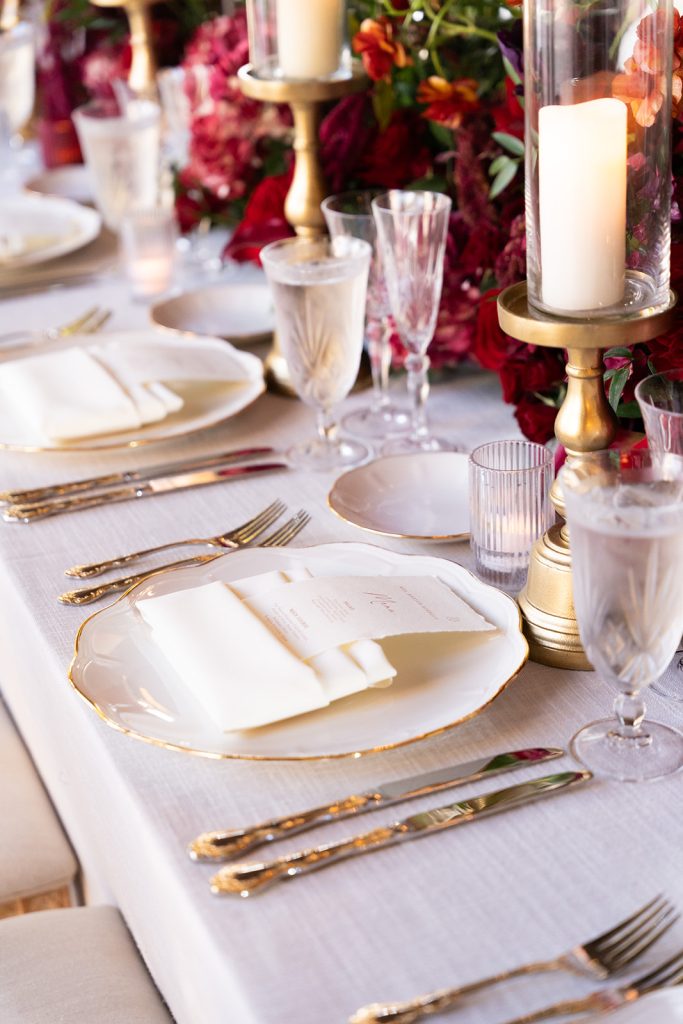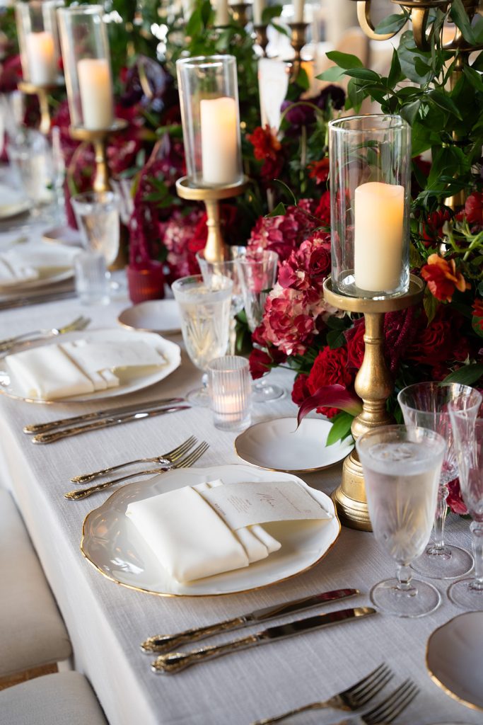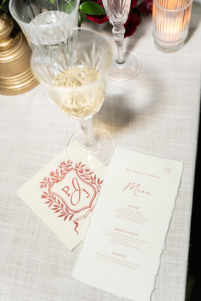 That deep red palette carried seamlessly throughout the entire celebration, weaving its way into every design element. Thoughtfully curated decor and rentals by Elements & Accents brought texture, depth, and cohesion to the space, elevating the atmosphere into something truly immersive. Every detail felt intentional, building on the moody romance that defined the day.