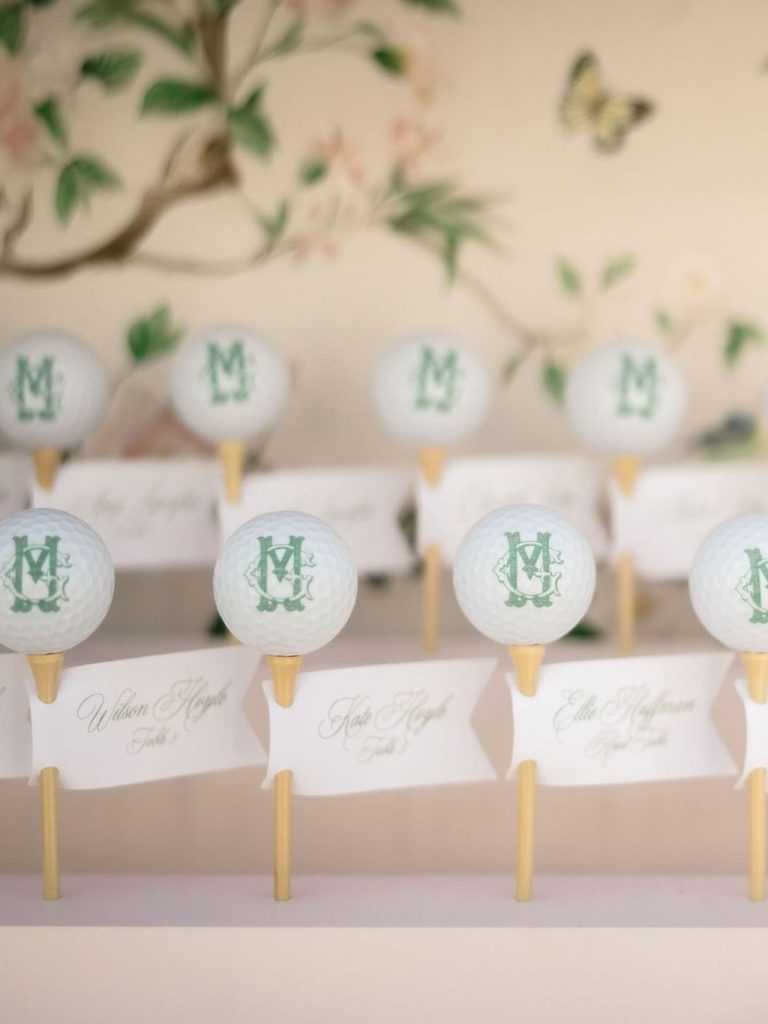 From the personalized monogrammed golf balls gifted to every guest to the incredible seating chart, every detail was uniquely them. And let’s not forget the custom dance floor by Wrap My Floor, which tied the whole aesthetic together and gave the reception that extra touch of wow.