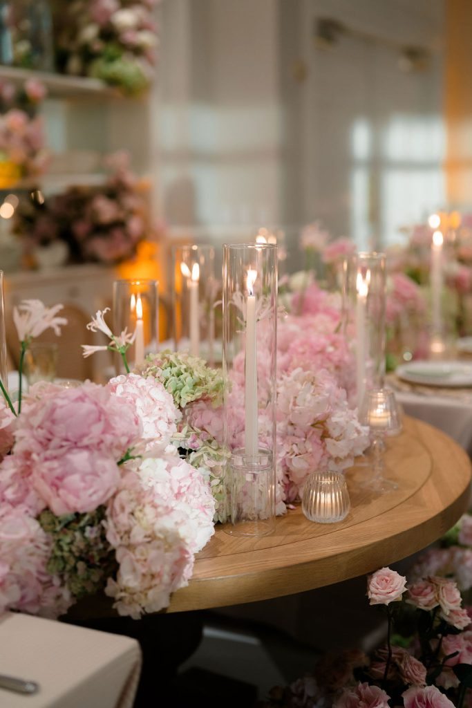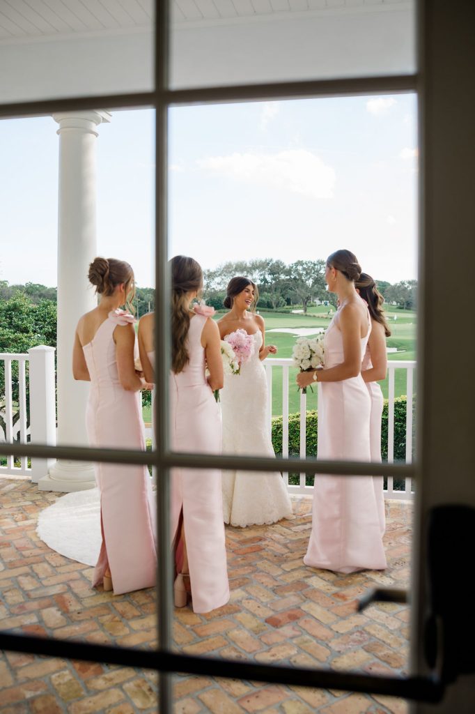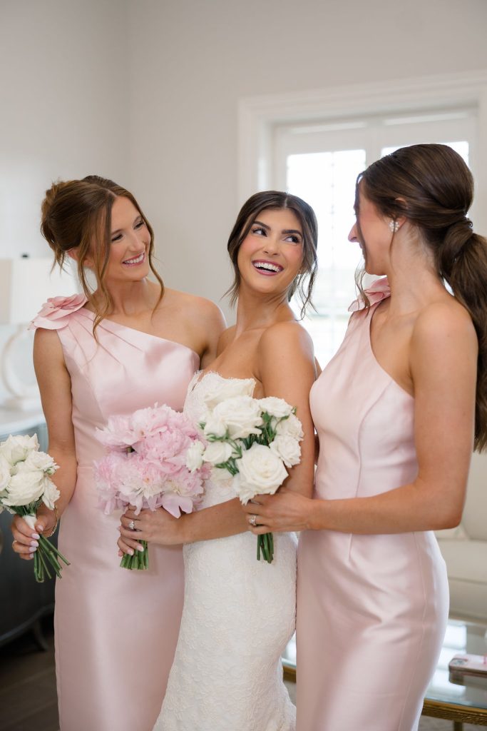 The bridal party looked picture perfect, with bridesmaids in stunning light pink dresses and crisp white bouquets, while the bride’s pink bouquet mirrored their pink gowns beautifully—a clever swap that made the colors feel intentional and fun.