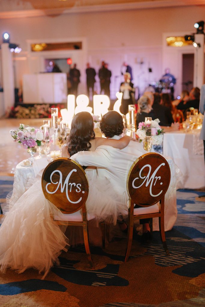 As the sun began to set and the sky filled with warm, glowing color, the ceremony naturally flowed into the reception. Their wedding planner, Sharon Goldman Events, shared that her main goal was to give the bride the sunset she dreamed of, even after night fell. The Spiegel’s round chuppah, designed in soft sunset ombré tones, became a beautiful focal point for the evening and one of the planner’s favorite elements to bring to life, along with the custom invitation suite, all created to keep that sunset feeling present throughout the night.