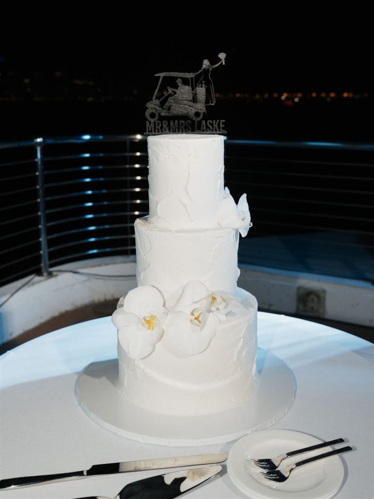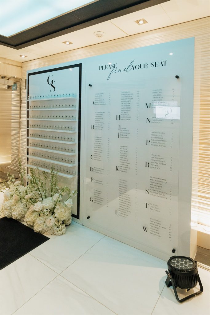 One of the standout design elements was the custom floor wrap created by MPE Event Group. This personalized detail helped transform the yacht’s deck into a fully styled reception space, tying together the overall design and creating a polished setting for dinner and dancing. It was a creative touch that made the celebration feel even more tailored to Sasha and Gabe’s vision.