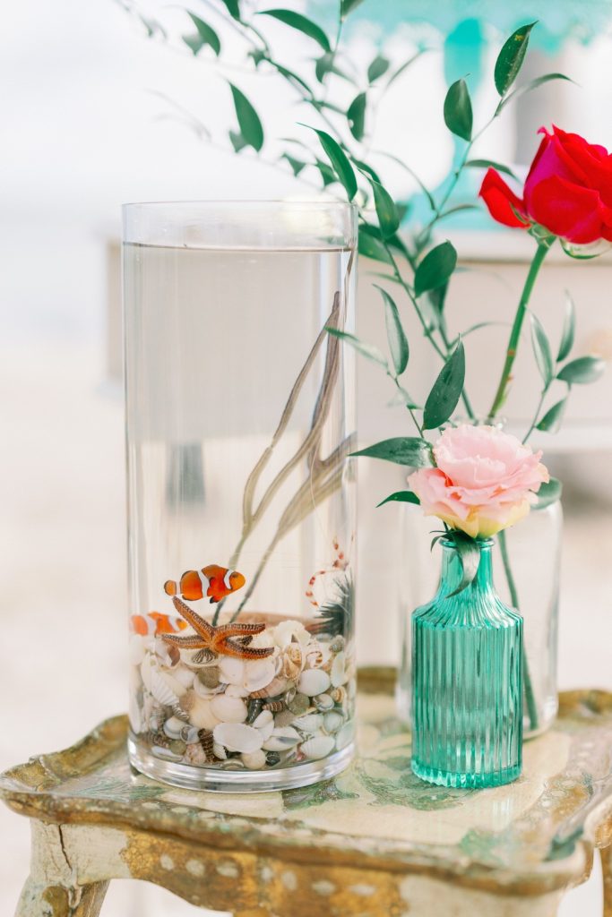 Create an authentic beach-themed experience for your engagement party, bridal shower, welcome party, rehearsal dinner or wedding with soft sand beneath your feet, the soothing sound of ocean waves, and vibrant coastal decor that captures the essence of seaside romance. Our team at Sea Life Centerpieces have been Florida Keys Marine Specialists for over a decade, and are proud to present unique beach theme centerpieces for your special day. We take great care to ensure the well being of our sea life and want you and your guests to enjoy a true coastal themed experience. Our team utilizes species that are very hardy and quite adaptable to the glass bowls and pillars and to the environment of the event. Having over a decade of experience in the care and maintenance of the saltwater marine life, we assure they are well nourished and healthy specimens. We pick up the centerpieces immediately after your event is over and safely transport them back to our facility and acclimate back to their home.
