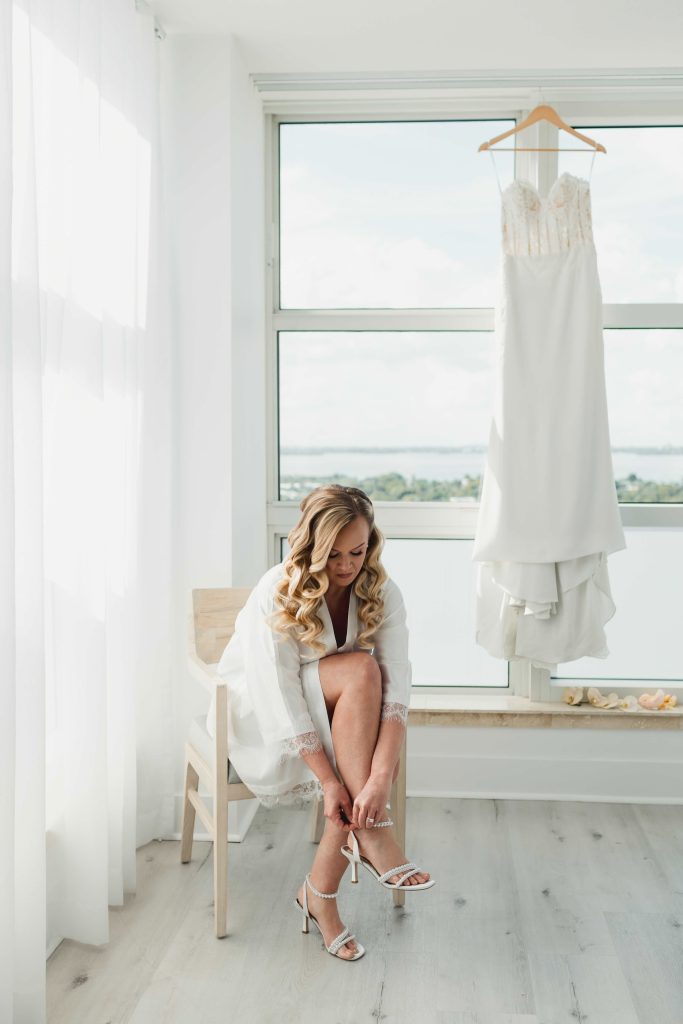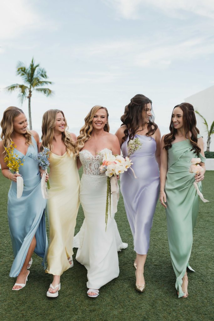 As the morning of the wedding unfolded, Cara got ready surrounded by her bridal party in a suite filled with light, laughter, and anticipation. She wore a stunning gown from Pronovias that felt both timeless and striking, perfectly suited for a refined seaside celebration. The beauty experience was equally intentional, with the expert team at Kiss This Make Up curating looks that enhanced each individual’s natural beauty while maintaining a cohesive, polished aesthetic across the entire bridal party.