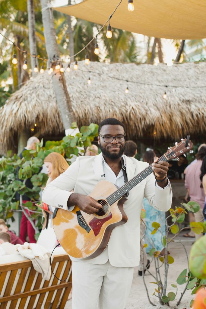 After the ceremony, guests made their way into a lively cocktail hour accompanied by live music from Rudy Lafrance. Thoughtfully selected rentals and tabletop details carried the design seamlessly from the ceremony into the reception, keeping the overall look cohesive and elevated.