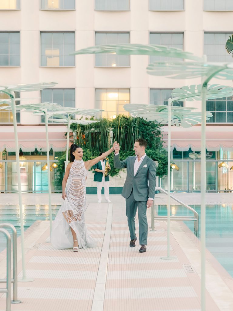 When the wedding day arrived, Rosa and her bridesmaids got ready in one elegant Faena suite while Patrick and his groomsmen gathered in another. Rosa then made a stylish entrance with her father, arriving at the church for a heartfelt ceremony. Afterward, everyone returned to the Faena Hotel to dance the night away beneath Miami’s glittering skyline.