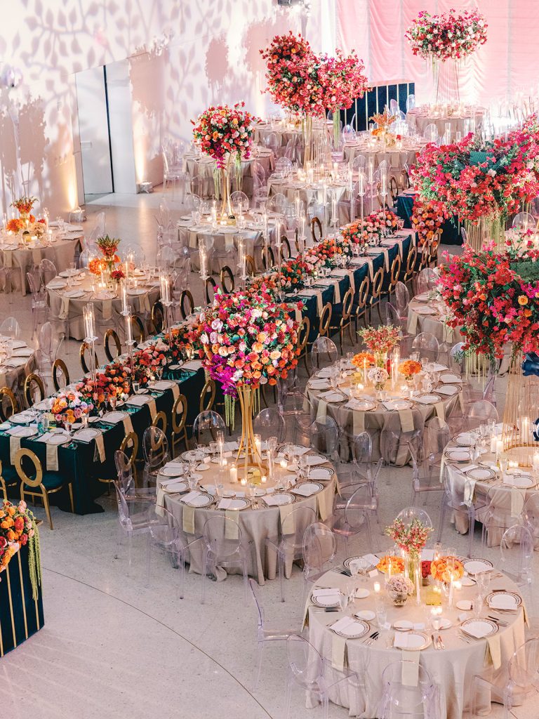 Floral design by Petal Productions was equally unforgettable. They truly outdid themselves, from dramatic head-table arrangements cascading to the floor to towering floral installations on the round tables and lush blooms woven throughout the space. Every detail left us speechless.