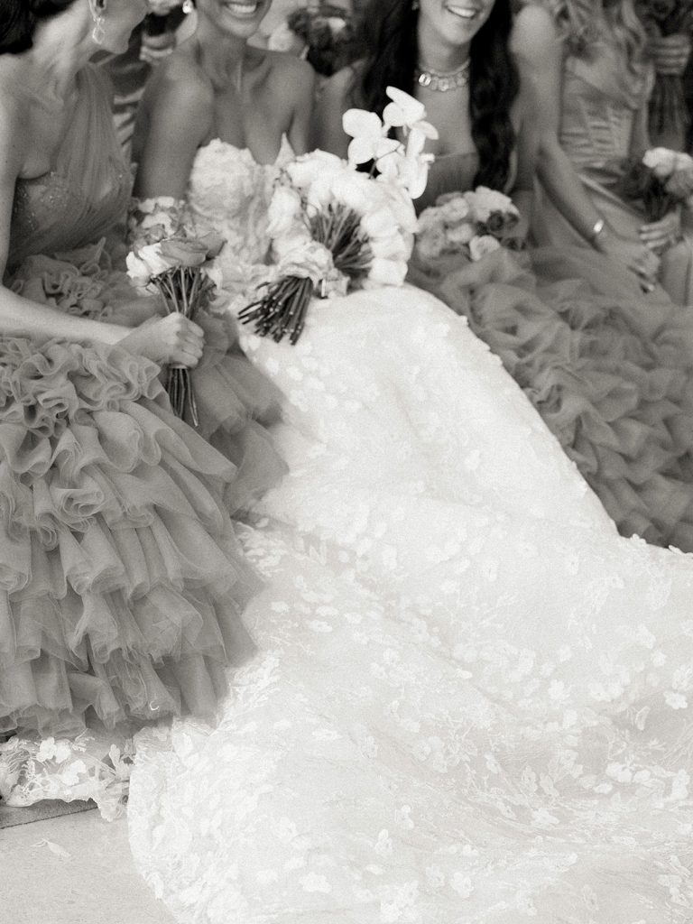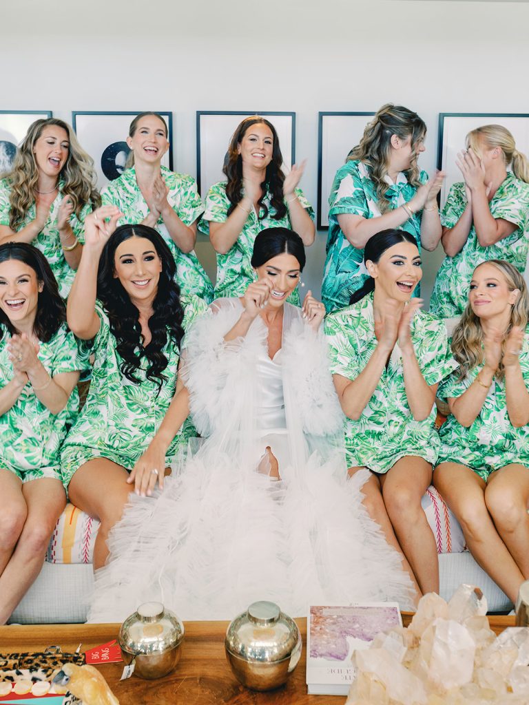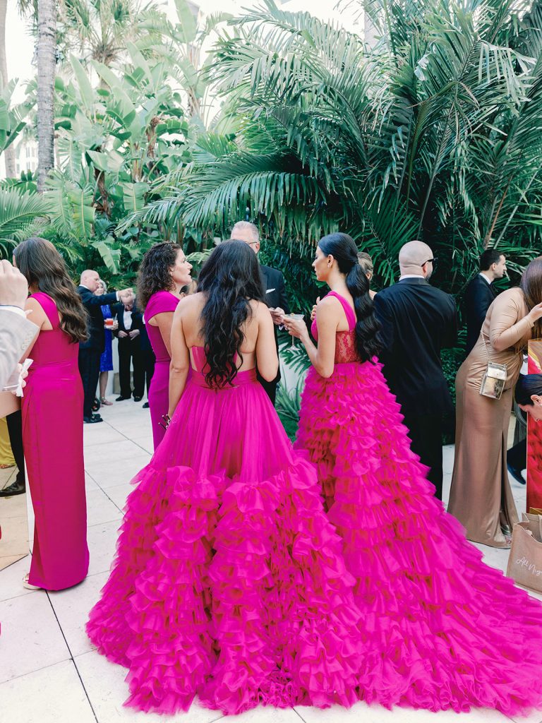 When it came time to choose the cover, we knew it had to capture pure Miami magic. What could be better than Rosa with her bridesmaids? Their mix of vibrant pink and orange dresses was striking: each shade unique, yet perfectly coordinated. Set against the iconic Faena Hotel’s jungle-mural wall, the photo radiates the bold, tropical energy we were looking for.