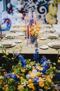 Rather than waiting for Italian shores to bring their vision to life, this couple infused South Florida with the spirit of Positano. The design unfolded in layers of cobalt and crisp white, echoing the tiled terraces and sunlit facades of the Amalfi Coast. Lemon-laced details nodded to the citrus groves of southern Italy, while sculptural florals featuring citrus branches and dried elements created an organic, coastal texture. Ceramic vessels, artisanal paper goods, and layered linens added warmth and depth to the tables cape, blending Mediterranean charm with modern edge.
