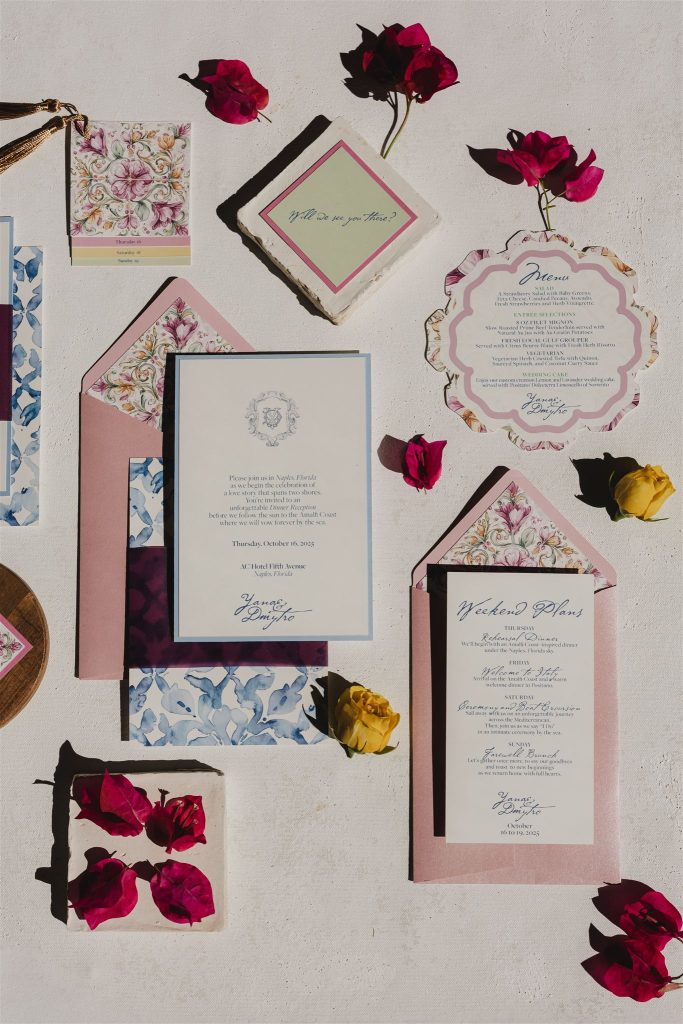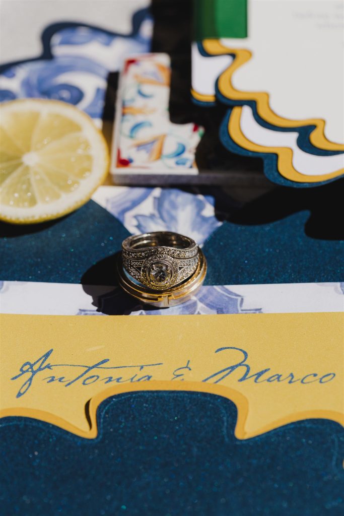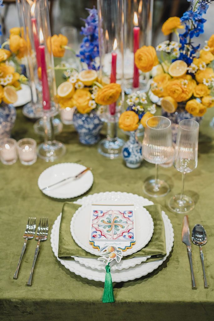 Every element felt intentional—bespoke menus with textured finishes, hand-painted tile motifs, zesty color moments woven throughout. Together, they told a story not just of a wedding abroad, but of the joy that builds before it.