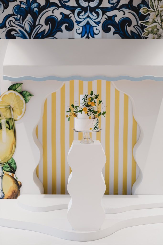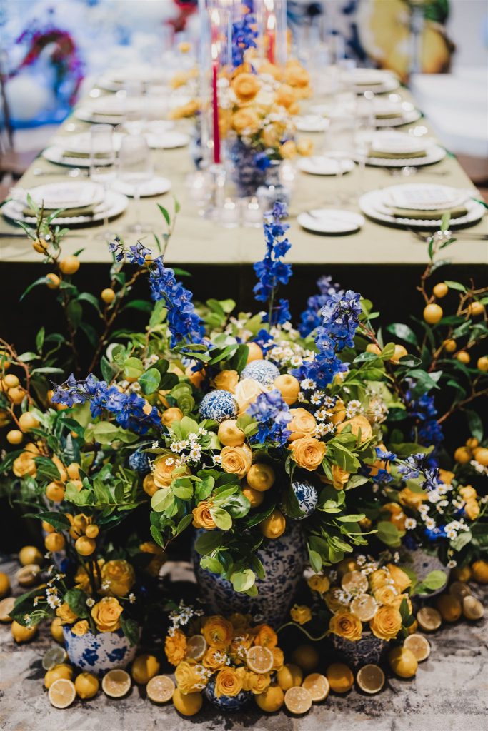Lemon motifs and citrus-forward floral installations
