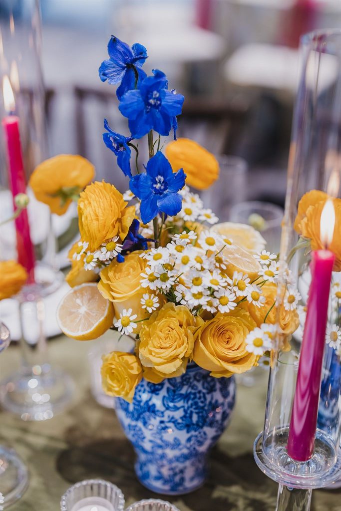 Rather than waiting for Italian shores to bring their vision to life, this couple infused South Florida with the spirit of Positano. The design unfolded in layers of cobalt and crisp white, echoing the tiled terraces and sunlit facades of the Amalfi Coast. Lemon-laced details nodded to the citrus groves of southern Italy, while sculptural florals featuring citrus branches and dried elements created an organic, coastal texture. Ceramic vessels, artisanal paper goods, and layered linens added warmth and depth to the tables cape, blending Mediterranean charm with modern edge.