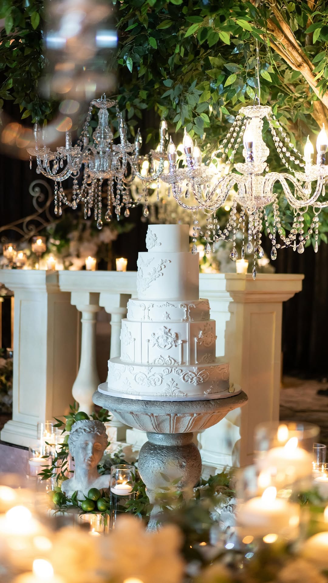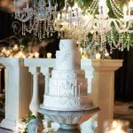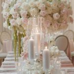 Multi-tiered white cake adorned with cascading pink blooms, displayed with crystal chandeliers and candles