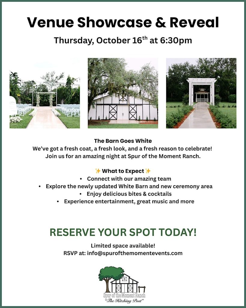 THE BARN GOES WHITE! We've got a fresh coat and fresh reason to celebrate! Spur of The Moment Ranch is inviting engagle couples in search of a venue for their wedding day! Please join us for an amazing night at Spur of The Moment Ranch Thursday, October 16 at 6:30pm Immerse yourselves in our unique setting. Connect with our amazing team. Explore our...